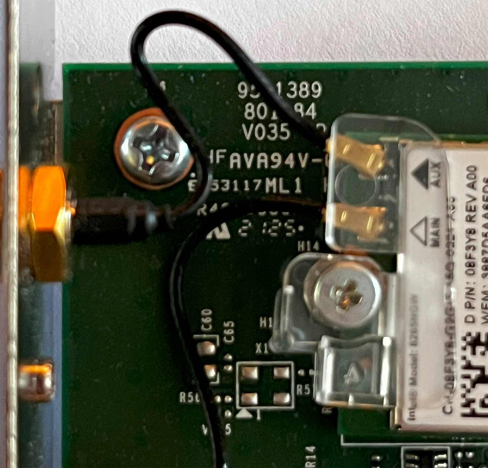Antennenkabel: Zwei kurze Kabel (Pigtails) verbinden das Modul Intel AX210 ze złączami SMA.