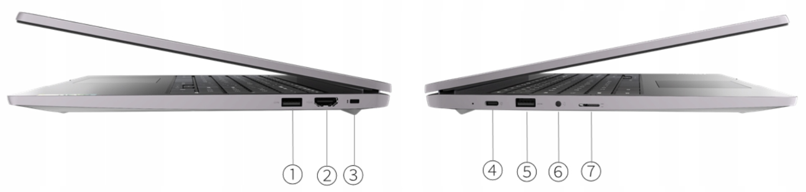 1. USB-A 3.2 Gen 1 | 2. HDMI 1.4 | 3. Gniazdo Kingston Security | 4. USB-C 3.2 Gen 1 (USB Power Delivery, DisplayPort) | 5. USB-A 3.2 Gen 1 | 6. Audio | 7. Czytnik Kart MicroSD