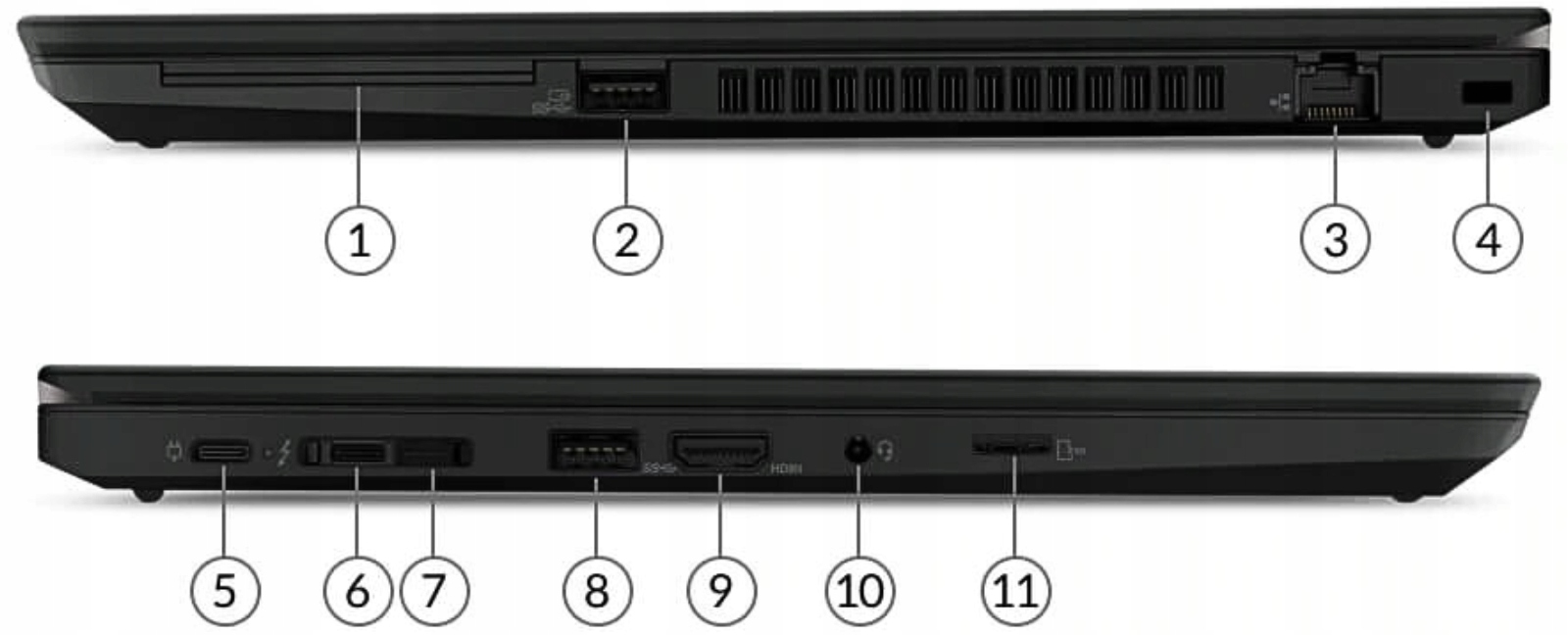 1. Czytnik kart SMART (Opcjonalnie) | 2. USB-A 3.2 Gen 1 (zawsze włączone) | 3. RJ-45 | 4. Gniazdo zabezpieczające Kensington Nano Security | 5. USB-C 3.2 Gen 1 | 6. USB-C 3.2 Gen 2 | 7. Konektor stacji dokującej | 8. USB-A 3.2 Gen 1 | 9. HDMI 1.4b | 10. Audio 3,5 mm | 11. Czytnik kart MicroSD