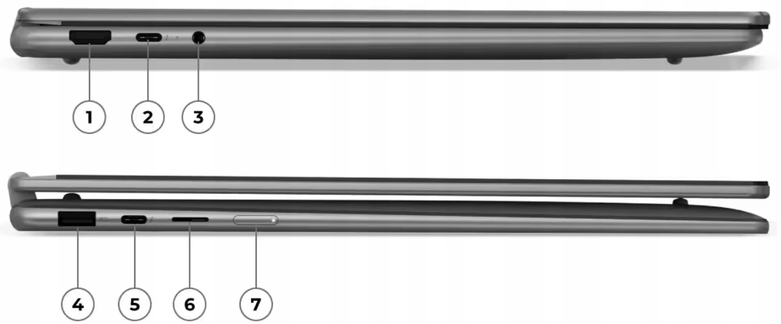 1. 1x HDMI 2.1 | 2. 1x Thunderbolt 4 | 3. Audio | 4. 1x USB-A 3.2 Gen 1 | 5. 1x Thunderbolt 4 | 6. Czytnik kart MicroSD | 7. Przycisk zasilania