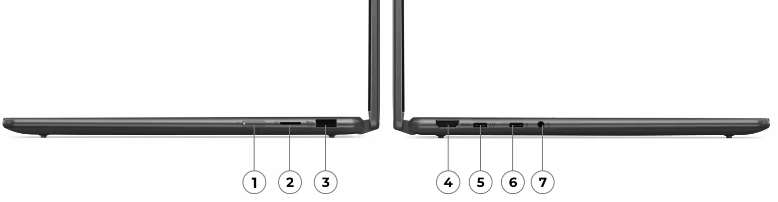1. Przycisk Zasilania | 2. Czytnik kart MicroSD | 3. 1x USB-A 3.2 Gen 1 | 4. HDMI 2.1 | 5.\6. 2x Thunderbolt 4 / USB4 (USB Power Delivery, DisplayPort™ 2.1) | 7. 1x Audio