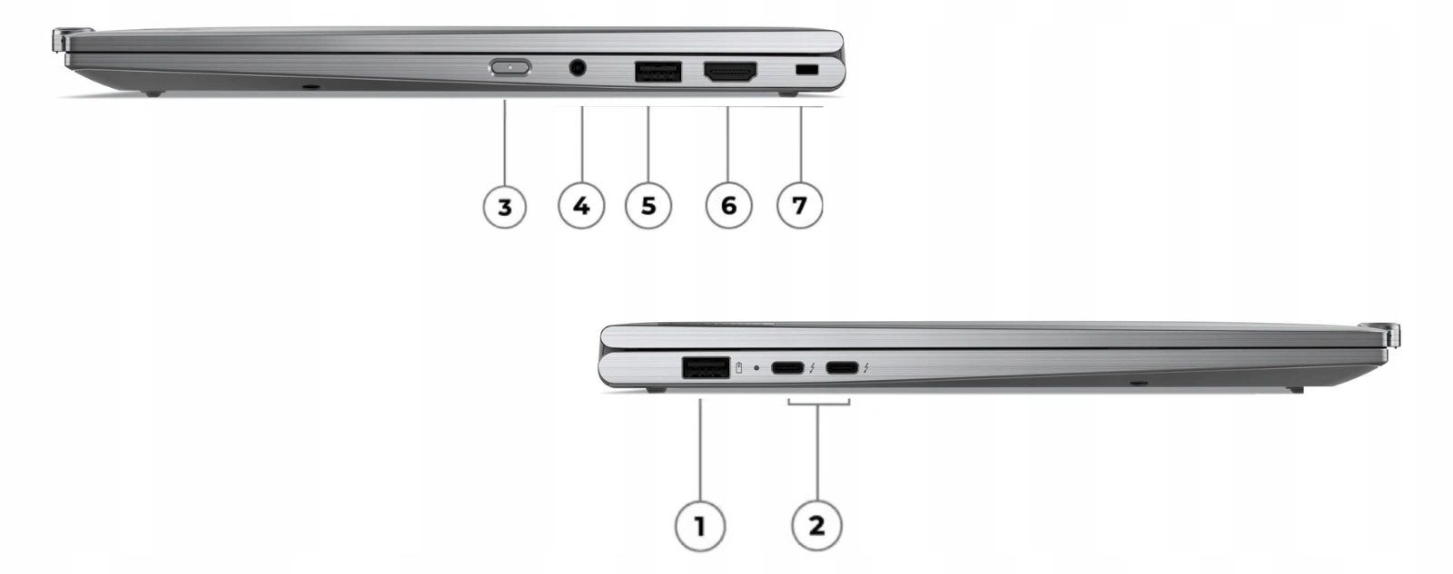1. USB-A 3.2 Gen 1 (zawsze włączone)| 2. 2x Thunderbolt 4 / USB4 (Power Delivery i DisplayPort) | 3. Złącze zasilania | 4. Audio | 5. USB-A 3.2 Gen 1 | 6. HDMI | 7. Kensington Nano Security Slot