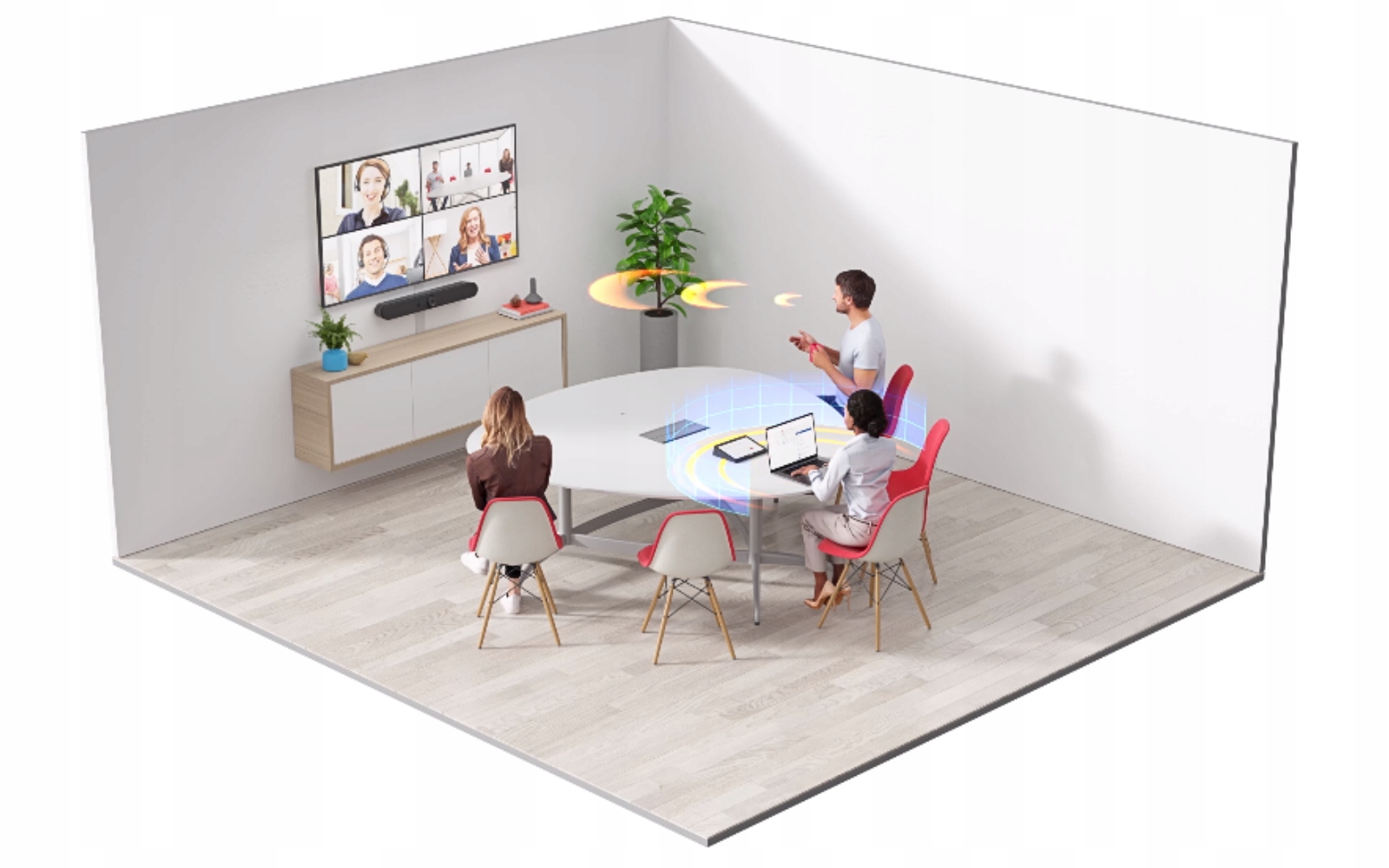 System audio w Rally Bar Mini gwarantuje, że każde słowo wybrzmi z nieskazitelną czystością, eliminując uciążliwe szumy i echo z otoczenia. Sześć zaawansowanych mikrofonów precyzyjnie wychwytuje głos każdej osoby w promieniu siedmiu metrów, sprawiając, że nawet szept jest doskonale słyszalny dla rozmówców. Mocne głośniki wypełnia małą salę głębokim i naturalnym dźwiękiem, dzięki czemu konferencje przypominają rozmowę twarzą w twarz. Dzięki inteligentnej optymalizacji RightSound, urządzenie automatycznie wyrównuje poziom głośności, dbając o Twój komfort i pełne skupienie na meritum spotkania.