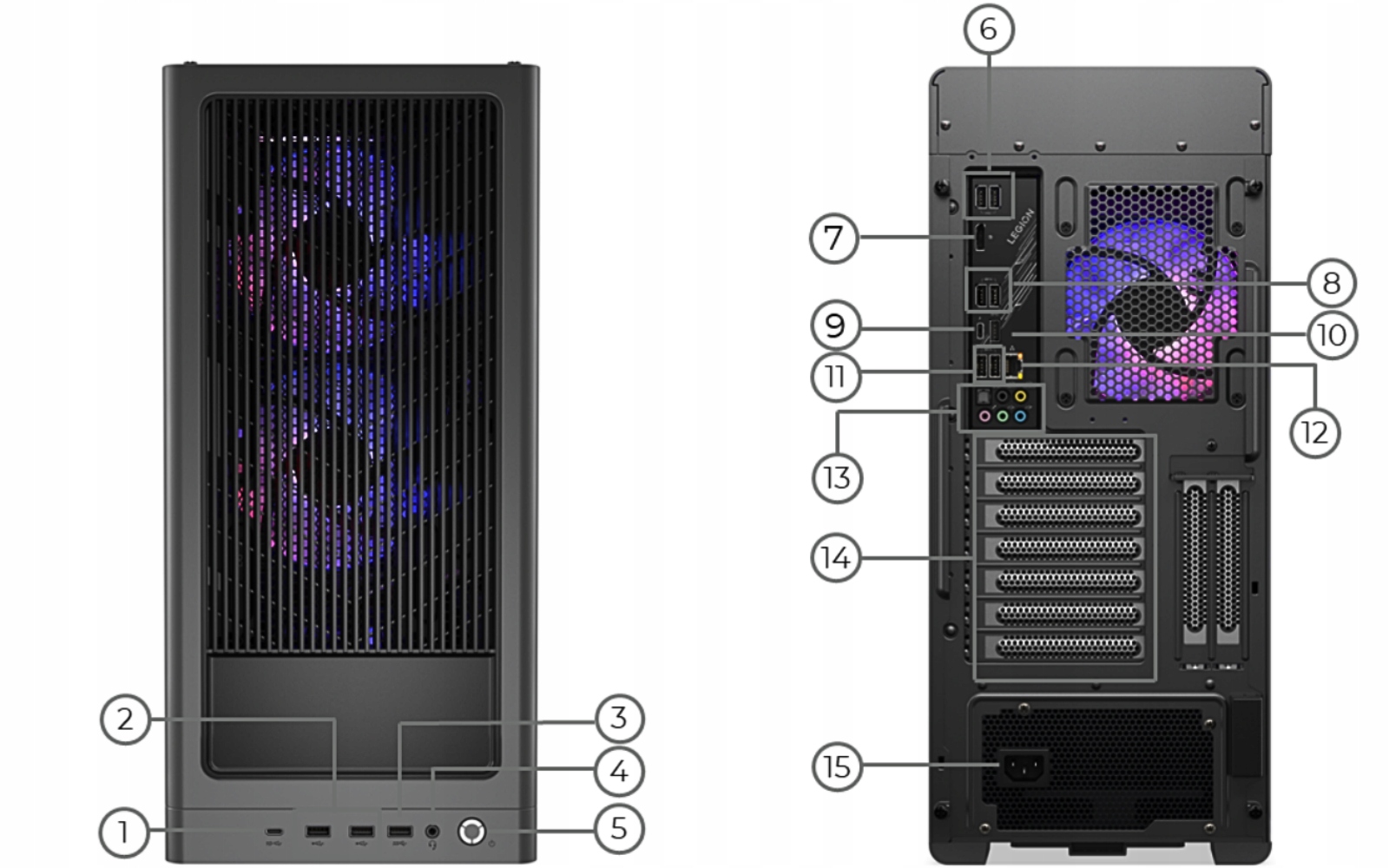 1. 1x USB-C | 2. 2x USB-A 2.0 | 3. 1x USB-C 3.2 Gen 1 | 4. 1x Audio | 5. Przycisk zasilania | 6. 2x USB-A 2.0 | 7. 1x DisplayPort 1.4 | 8. 2x USB-A 3.2 Gen 1 | 9. 1x Thunderbolt 4 | 10. 1x USB-A 3.2 Gen 2 | 11. 1x USB-A 3.2 Gen 1 | 12. 1x Rj-45 (2,5GbE) | 13. 6x Wyjścia Audio | 15. Port zasilania