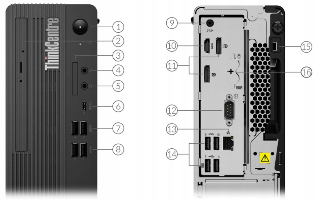 1. Przycisk zasilania | 2. Napęd optyczny (Opcjonalnie) | 3. Czytnik kart (opcjonalny) | 4/5. Audio | 6. USB-C 3.2 Gen 1 | 7. 2x USB-A 3.2 Gen 1 | 8. 2x USB-A 3.2 Gen 2 | 9. Audio | 10. HDMI | 11. 2x USB-A 3.2 Gen 1 | 12. 9-pin Serial | 13. RJ-45 | 13. 4x USB-A 2.0