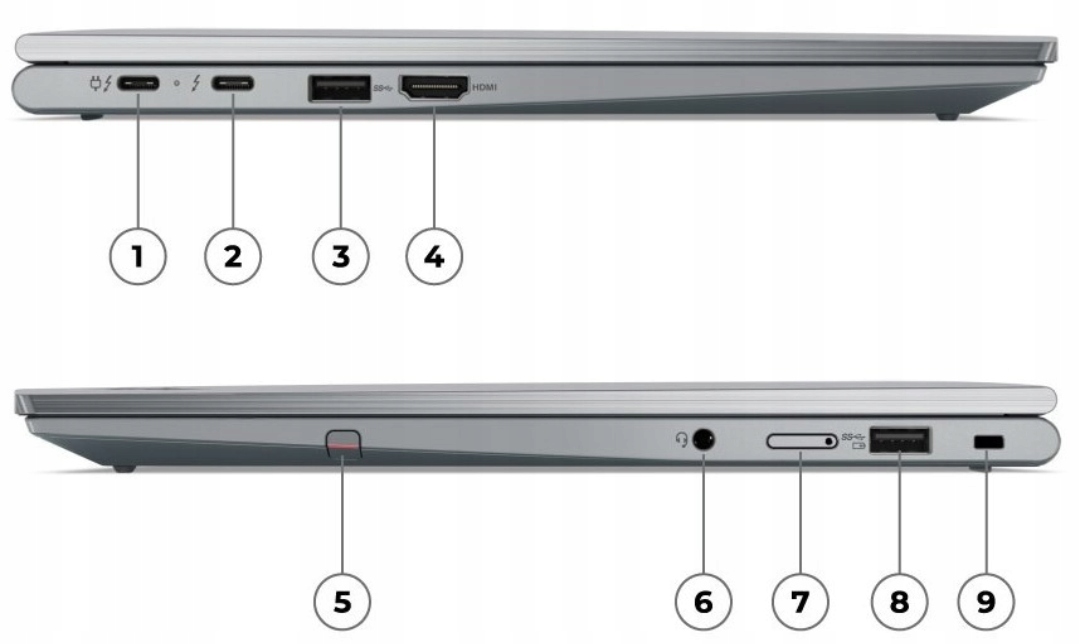 1. Thunderbolt 4 | 2. Thunderbolt 4 | 3. USB-A 3.2 Gen 1 | 4. HDMI | 5. Pen Slot | 6. Złącze mikrofonowo/słuchawkowe | 7. Czytnik Nano SIM (Opcjonalnie) | 8. USB-A 3.2 Gen 1 | 9. Gniazdo linki zabezpieczającej Kensington Nano Security Slot