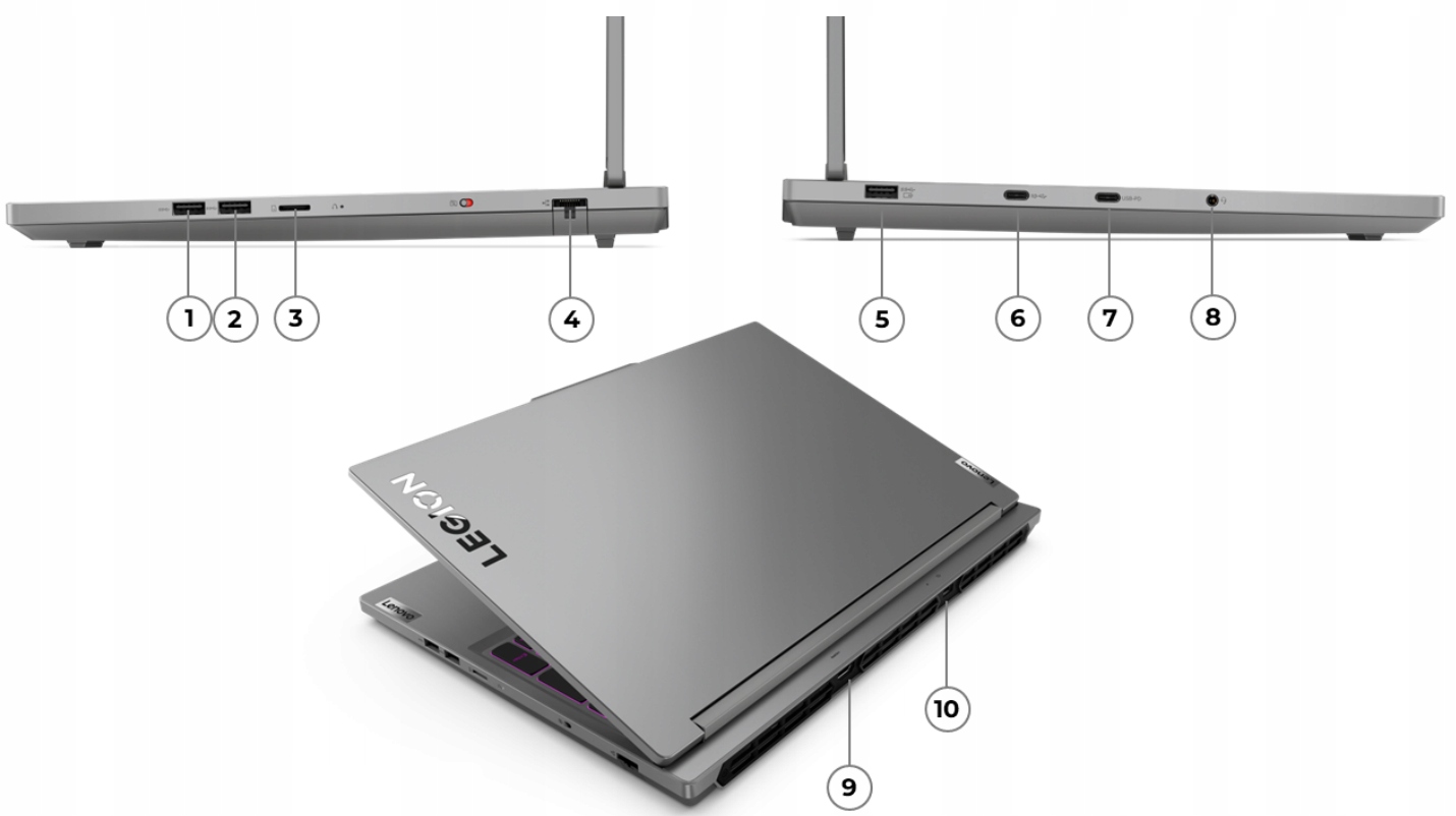 1. USB-A 3.2 Gen 1 | 2. USB-A 3.2 Gen 1 | 3. Czytnik kart (Opcjonalnie) | 4. RJ-45 | 5. USB-A 3.2 Gen 1 (Always On) | 6. USB-C 3.2 Gen 2 (DP 1.4) | 7. USB-C 3.2 Gen 2 (PD 140W & DP 1.4) | 8. Złącze audio combo jack 3,5 mm | 9. HDMI 2.1 | 10. Gniazdo zasilania