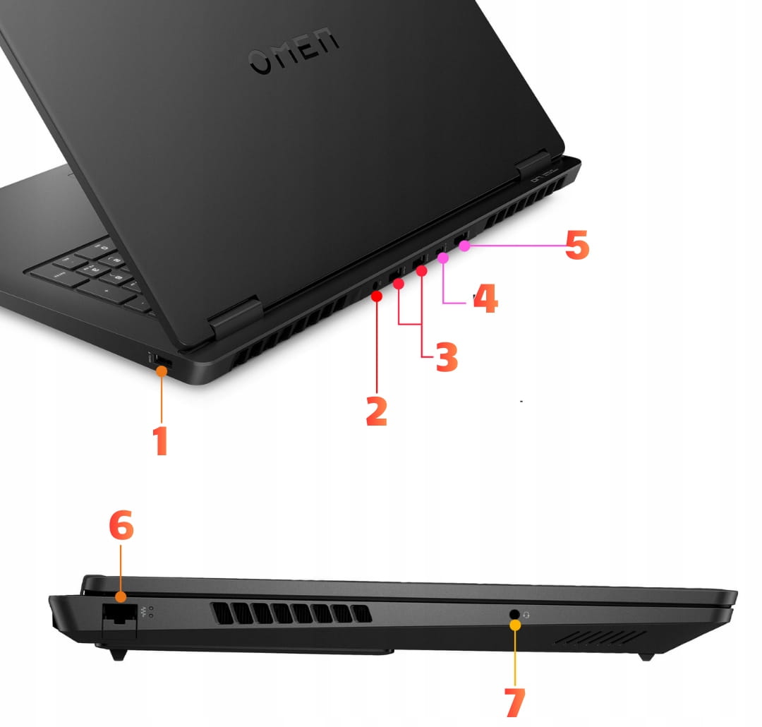 - Porty: 2x USB-A 3.2 Gen 2 ; 1x USB-A 3.2 Gen 1 ; 1x USB-C 3.2 Gen 2 ; 1x HDMI 2.1 ; 1x Złącze audio (3.5 mm) ; 1x RJ-45