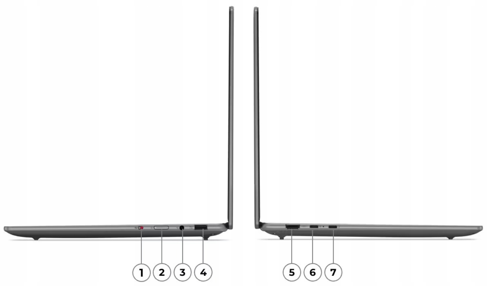 1. Przełącznik E-shutter | 2. Przycisk zasilania | 3. Audio (3.5mm) | 4. USB-A 3.2 Gen 1 (zawsze włączone) | 5. USB-C 3.2 Gen 2 (USB Power Delivery 3.0, DisplayPort 2.1) | 6. HDMI 1.4b | 7. USB4 (USB Power Delivery 3.0, DisplayPort 1.4)