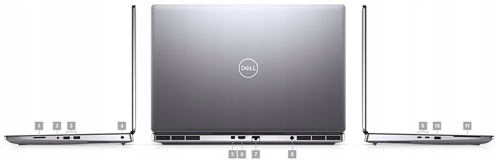1. Czytnik kart SD | 2. 1x Audio | 3. 2x USB-A 3.2 Gen 1 | 4. Gniazdo linki zabezpieczającej | 5. 1x Mini DisplayPort 1.4 | 6. 1x HDMI 2.1 | 7. 1x RJ-45 | 8. Port zasilania | 9. 2x USB-C 3.2 Gen 2 (Thunderbolt 4) | 10. 1x USB-A 3.2 Gen 1 (z funkcją PowerShare) | 11. Czytnik Smart Card