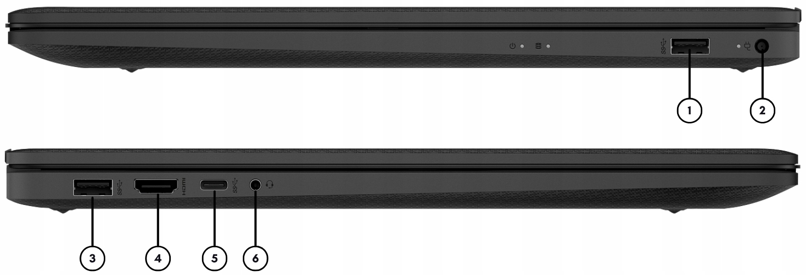 1. USB-A 3.2 Gen 1 | 2. Port zasilania | 3. USB-A 3.2 Gen 1 | 4. HDMI 1.4b | 5. USB-C 3.2 Gen 1 (z Power Delivery, DisplayPort 1.4, HP Sleep and Charge) | 6. Audio