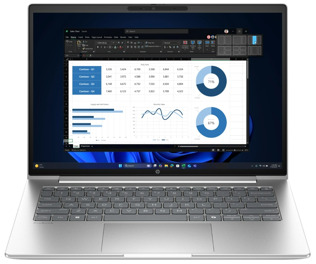 Przejmij pełną kontrolę nad swoimi zadaniami dzięki przestronnej matrycy 14" o nowoczesnych proporcjach 16:10, które pomieszczą znacznie więcej treści niż standardowe ekrany. Rozdzielczość WUXGA (1920 x 1200) w połączeniu z technologią IPS gwarantuje ostry obraz i szerokie kąty widzenia, idealne do wspólnego oglądania prezentacji czy filmów. Jasność na poziomie 300 nitów oraz matowa powłoka antyrefleksyjna zapewniają komfortową pracę nawet w jasno oświetlonych pomieszczeniach, dbając o Twój wzrok przez cały dzień. Wyświetlacz z pokryciem palety 62.5% sRGB to solidne rozwiązanie do codziennych wyzwań biurowych i multimediów, oferujące naturalne barwy przy zachowaniu świetnej energooszczędności.