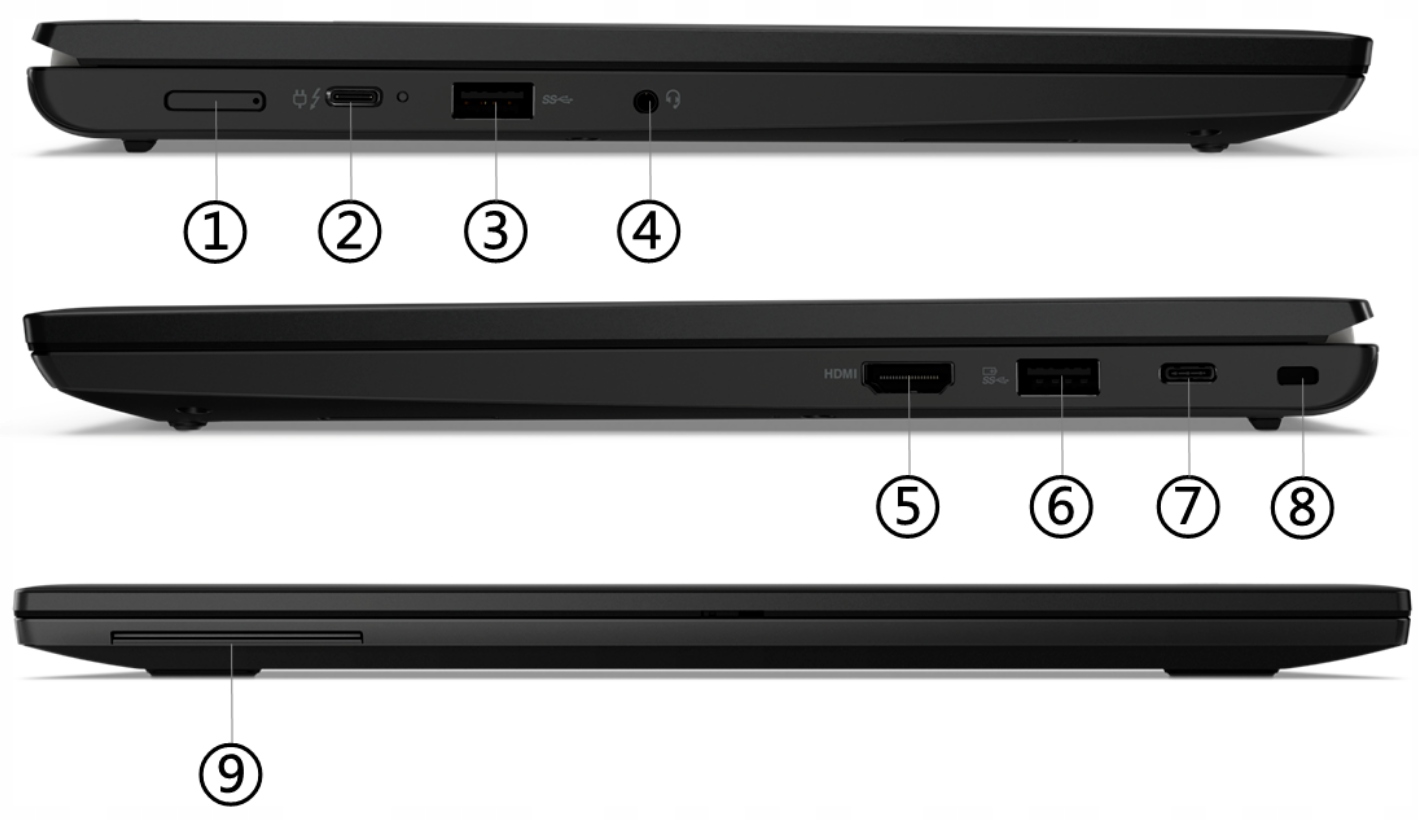 1. Czytnik kart Nano-SIM (opcjonalnie) | 2. USB-C 3.2 Gen 2 | 3. USB-A 3.2 Gen 1 | 4. Audio | 5. HDMI | 6. USB-A 3.2 Gen 1 | 7. USB-C 3.2 Gen 2 | 8. Gniazdo Kensington Nano Security | 9. Czytnik Smart Card (opcjonalnie)
